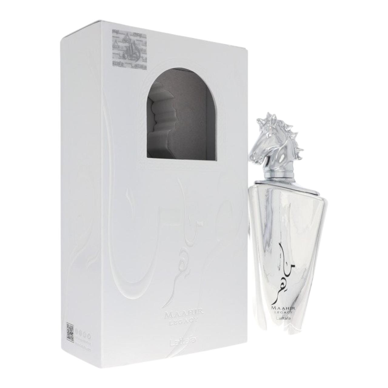 Maahir Legacy by Lattafa Perfumes is a fragrance for men. Top notes are Lime, Mint, Grapefruit, Lavender and Pineapple; middle notes are juniper berry, Black Pepper, Rosemary, Geranium and Frankincense; base notes are Ambroxan, Oakmoss, Vetiver, Cashmeran and Tonka Bean.